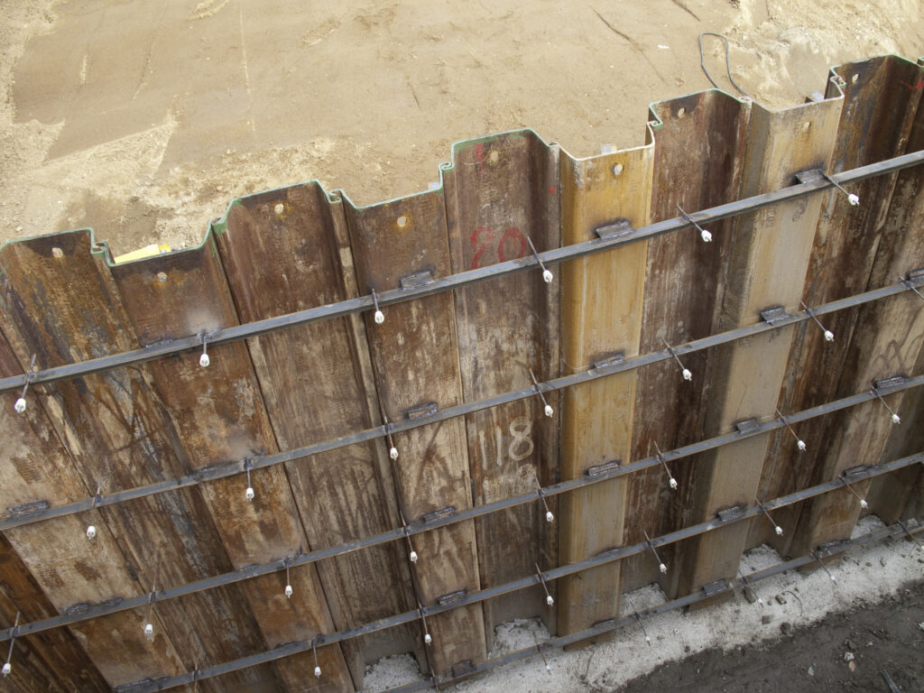 矢板とは、基礎工事などの際、周囲に打ち込む板状の杭のことで、土砂の崩壊や水の浸入を防げます。土圧への抵抗力が強いので、港湾工事や河川工事、都市土木工事、橋梁工事など、幅広く利用されているのが特徴です。シートパイルと呼ばれることもあります。
