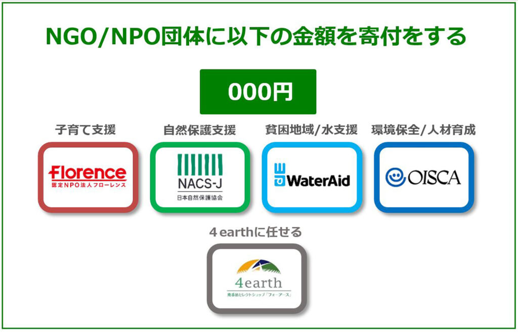真家:また、4earthでは、売上の一部をNGOやNPOに寄付するというプログラムを実施しています。購入者に寄付先を任意で選択していただき、4earthから各団体へ寄付を行うという仕組みです。