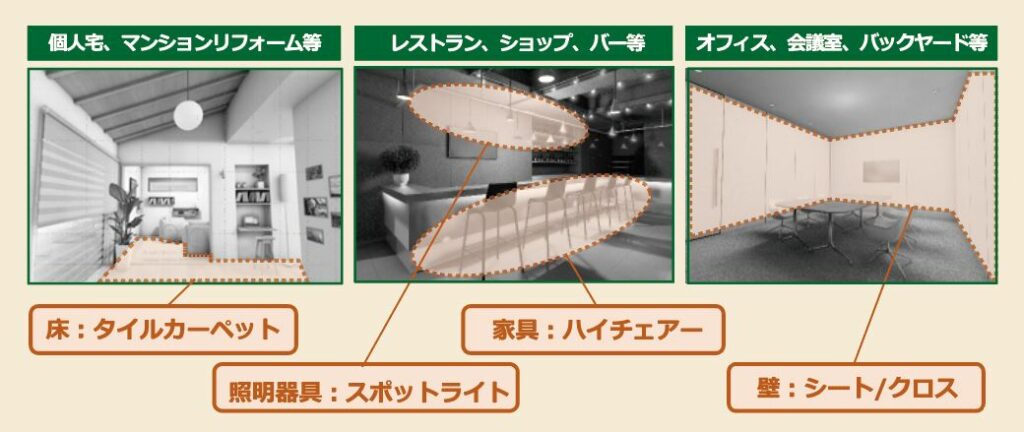 真家:今は40社のメーカーに協力頂いており、商品点数は全部で500点以上あります。(2022年11月時点)例えばタイルカーペットやスポットライト、ハイチェアー、壁のシートやクロスなどですね。