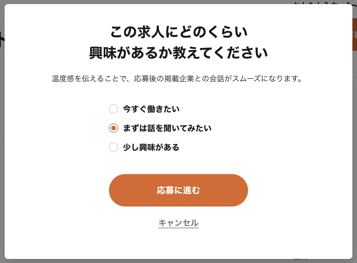 選択肢は「今すぐ働きたい」・「まずは話を聞きたい」・「少し興味がある」の3つから選ぶことができ、その選択は応募企業に伝わるようになっています。