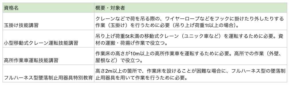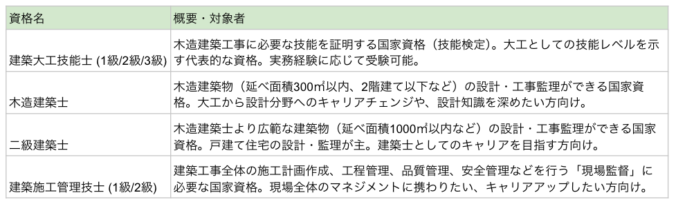 ここでは、特に大工にとって関連性の高い主要な資格について、もう少し詳しく見ていきましょう。