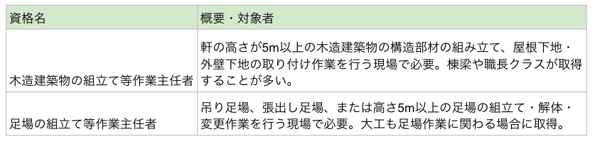 ・資格概要、必要性: 労働安全衛生法に基づき、軒高5m以上の木造建築の構造部材の組立てや、屋根・外壁下地の取り付け作業を行う際に、現場に必ず配置しなければならない作業主任者の資格です。労働災害を防止するための管理・監督を行います。