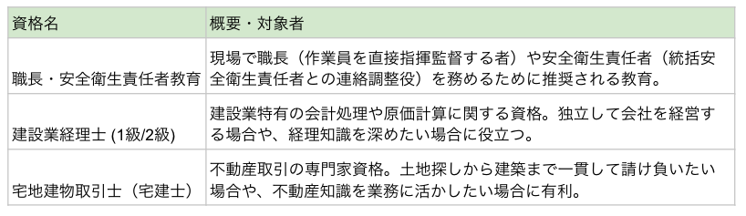 直接的な大工仕事以外で、キャリアアップや独立開業に役立つ可能性のある資格です。