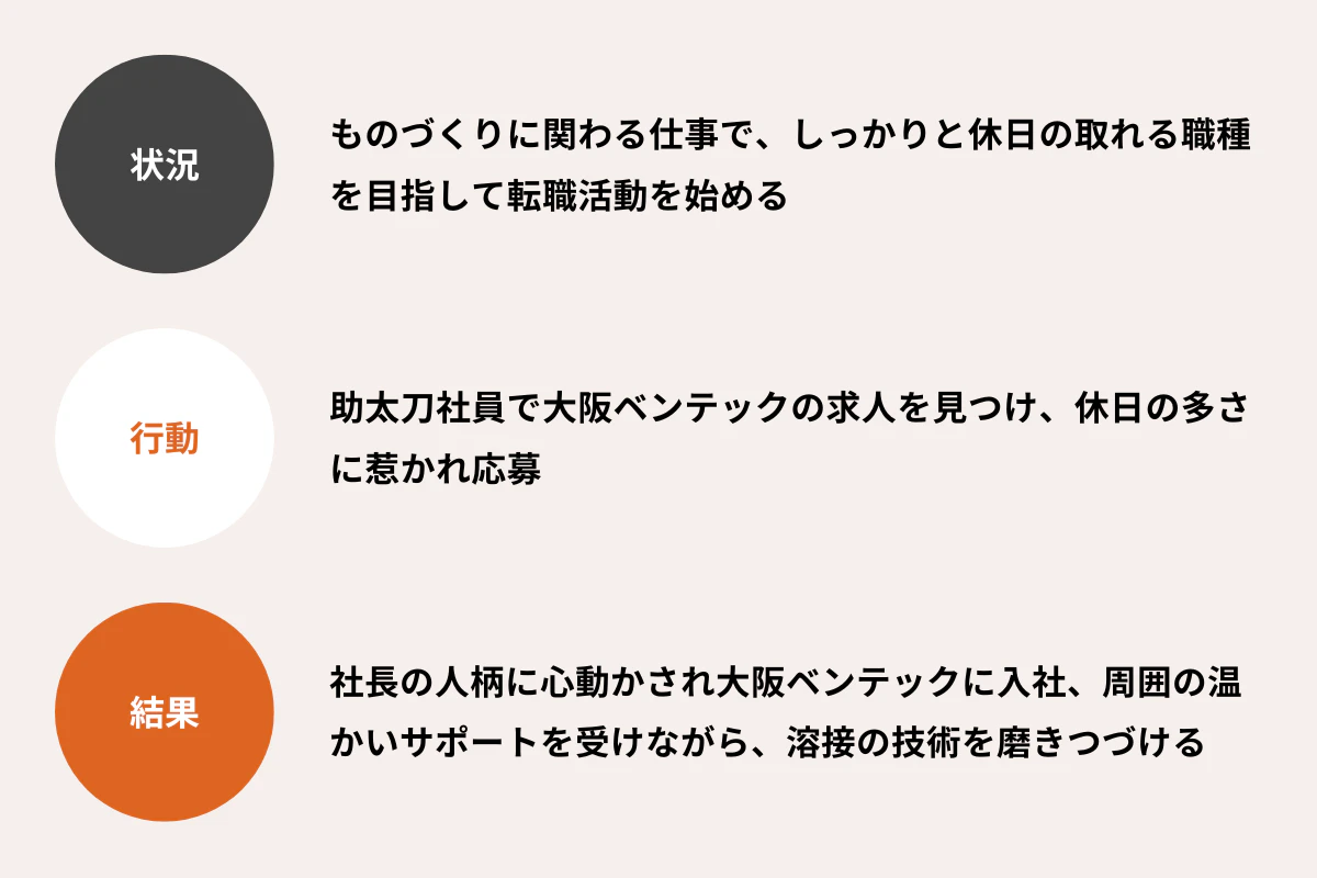 高橋:やはり他の会社より休日がしっかりしている点が良かったです。他にも条件のいい会社はありましたが、休日については大阪ベンテックの条件が一番良かったと思います。