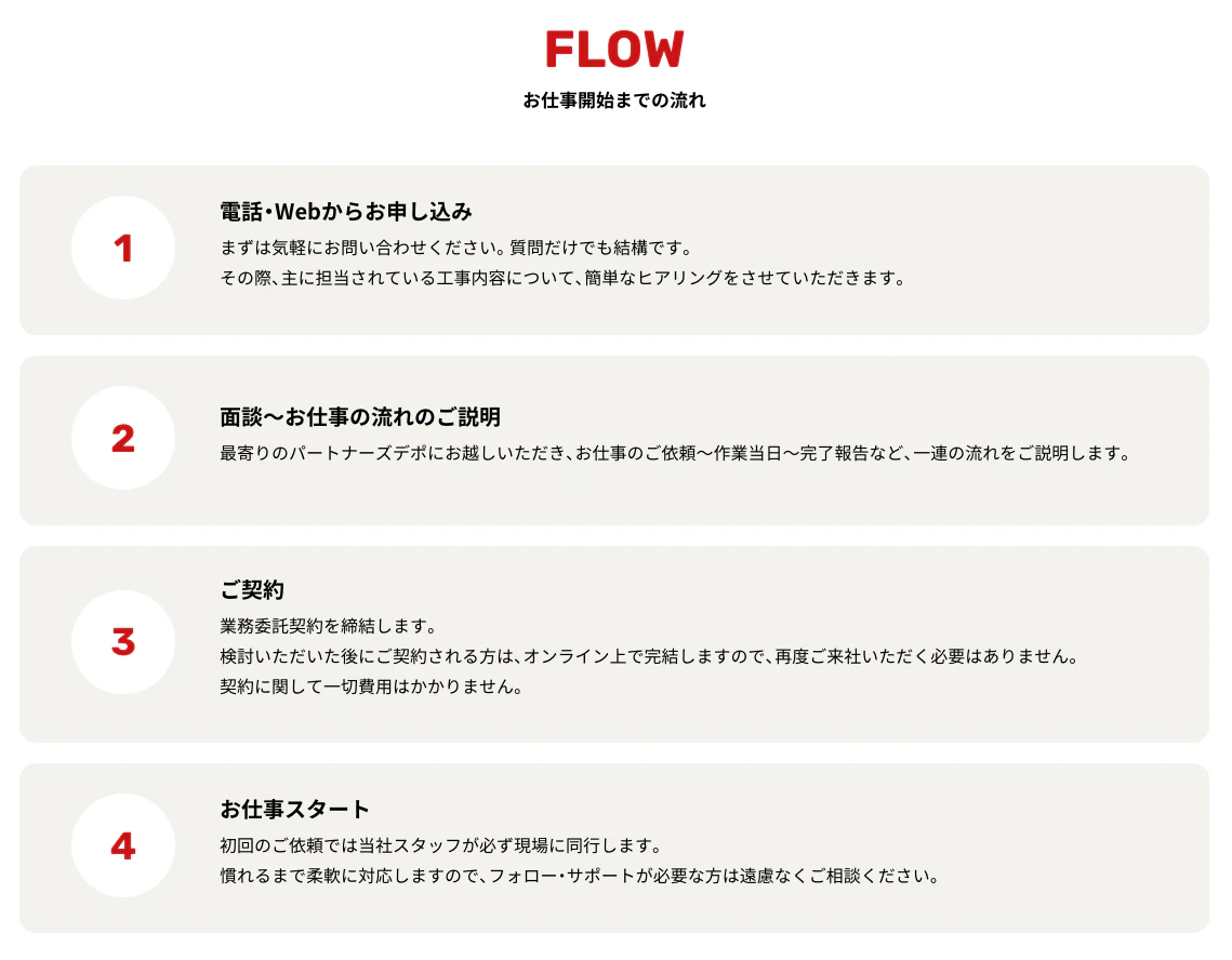 パートナーズデポでは、お仕事始める前に施工マニュアルの提供やトレーニングスペースも完備していますので、個人事業主としてお仕事をスタートされたばかりの方も安心して現場に入っていただけます。