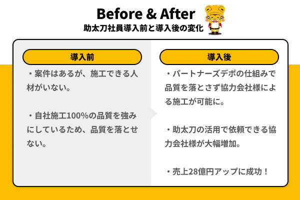 そこで同社は、協力会社との連携を強化する「パートナーズデポ」という独自の仕組みと、助太刀の活用により、売上高を28億円アップさせるという目覚ましい成果を上げました。