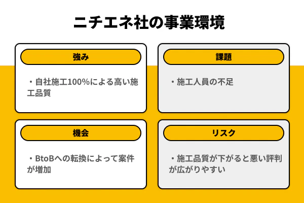 株式会社ニチエネも、自社施工100%による高い施工品質を強みとしていましたが、施工人材の不足が成長の足かせとなっていました。