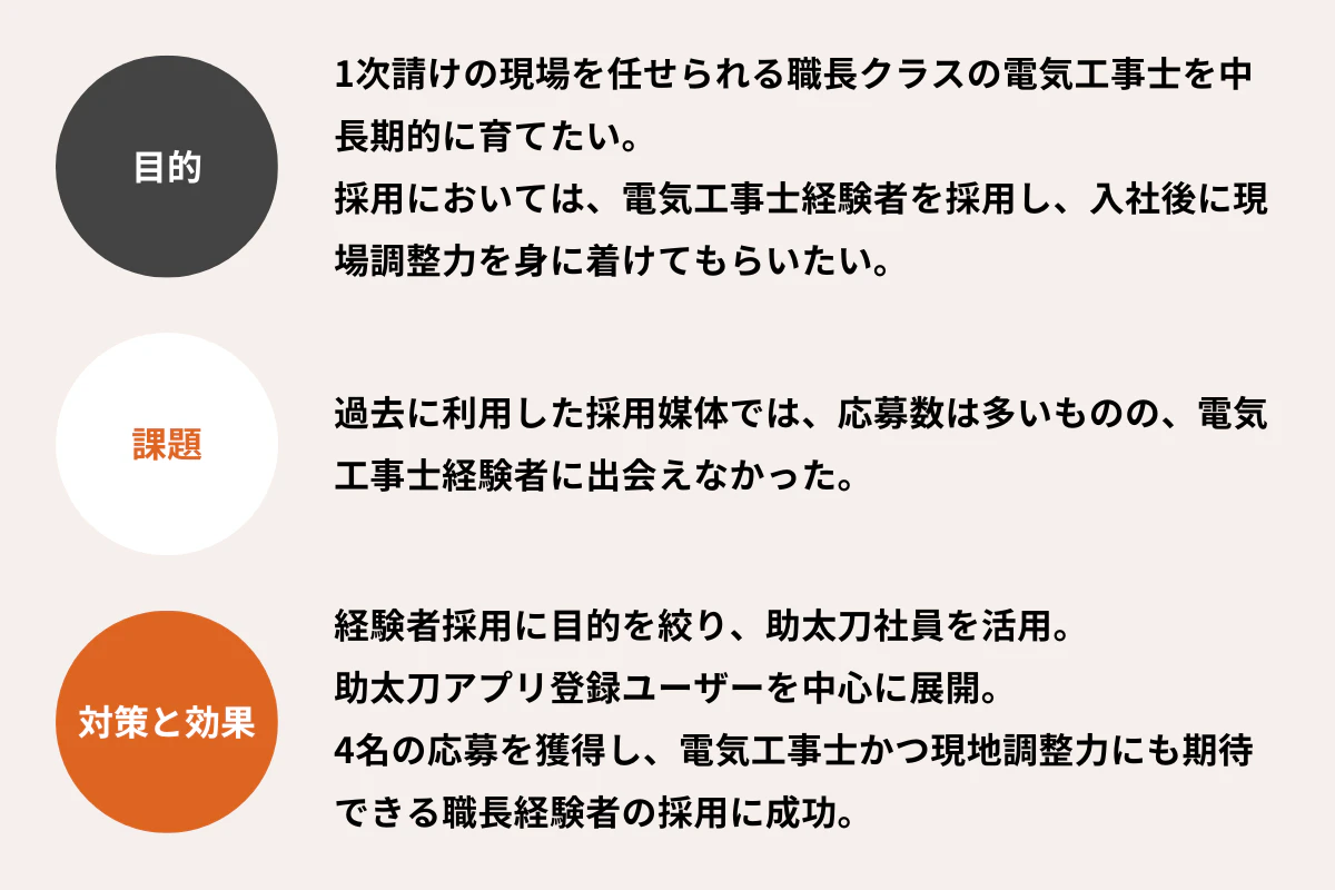 ・過去に利用した採用媒体では、応募数は多いものの、電気工事士経験者に出会えなかった。