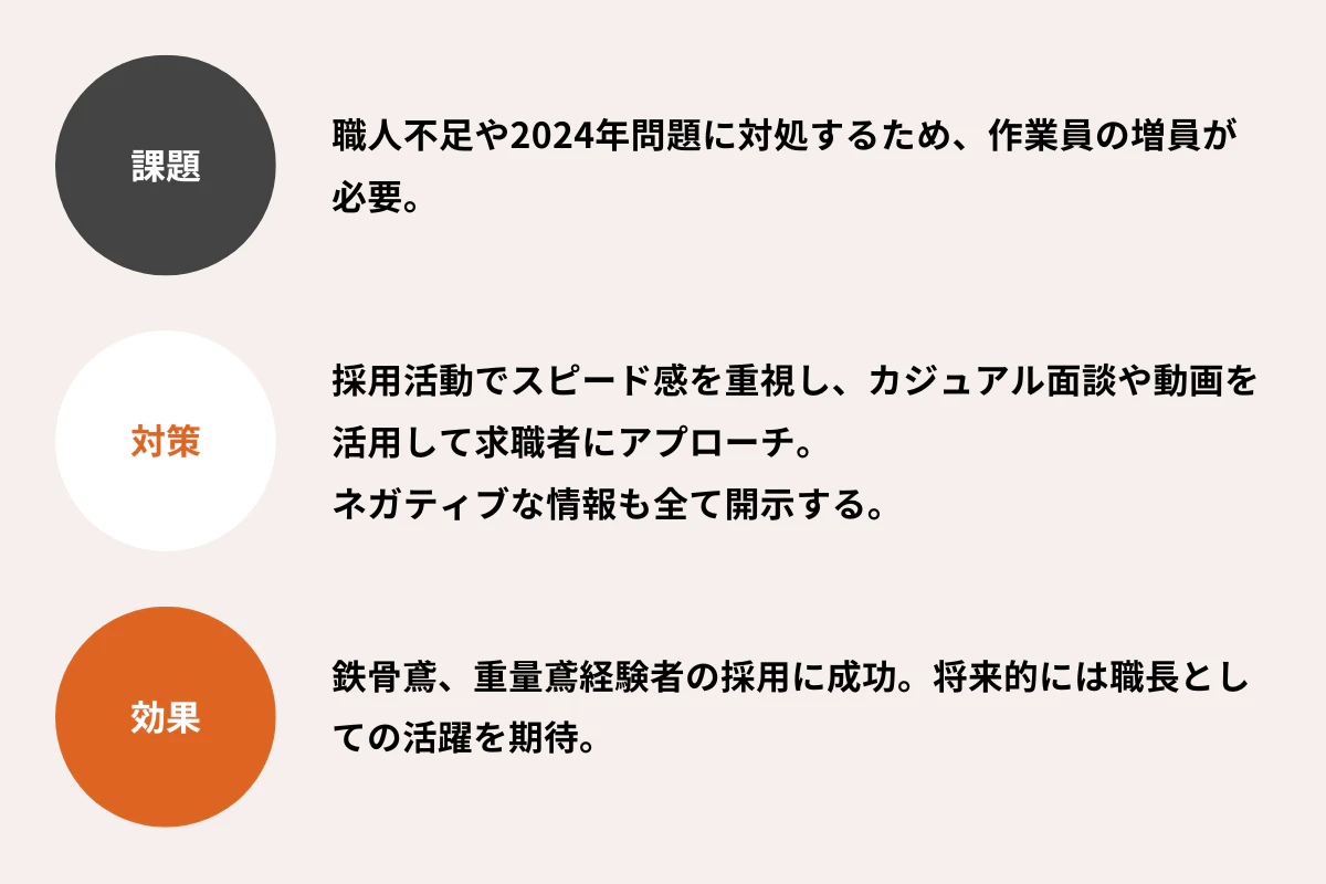 - 鉄骨鳶、重量鳶経験者の採用に成功。将来的には職長としての活躍を期待。