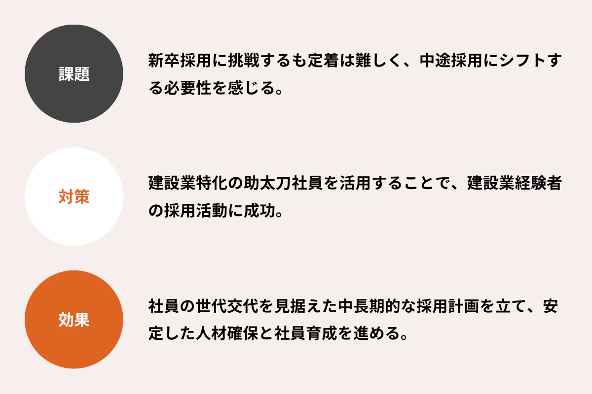 ・建設業特化の助太刀社員を活用することで、建設業経験者の採用活動に成功。