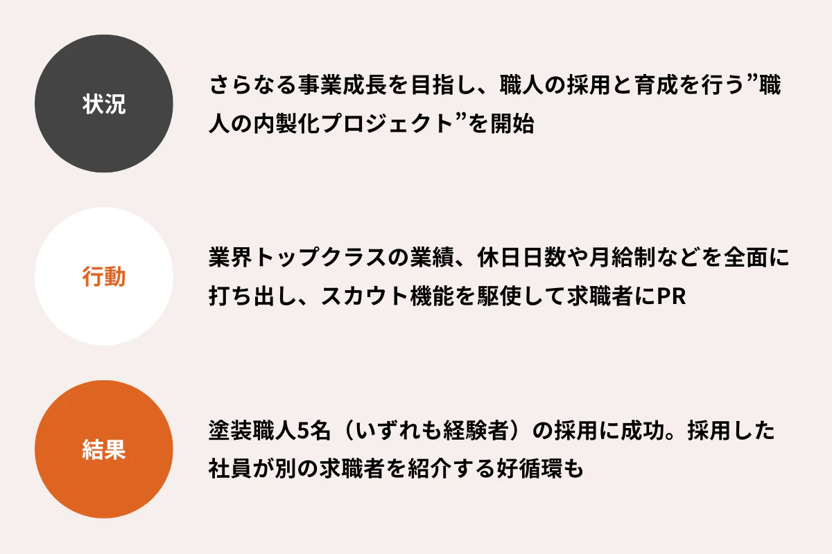その後、ターゲットが法人に変わり、内製化する職人も塗装職人に変わったため、私は採用担当になりました。