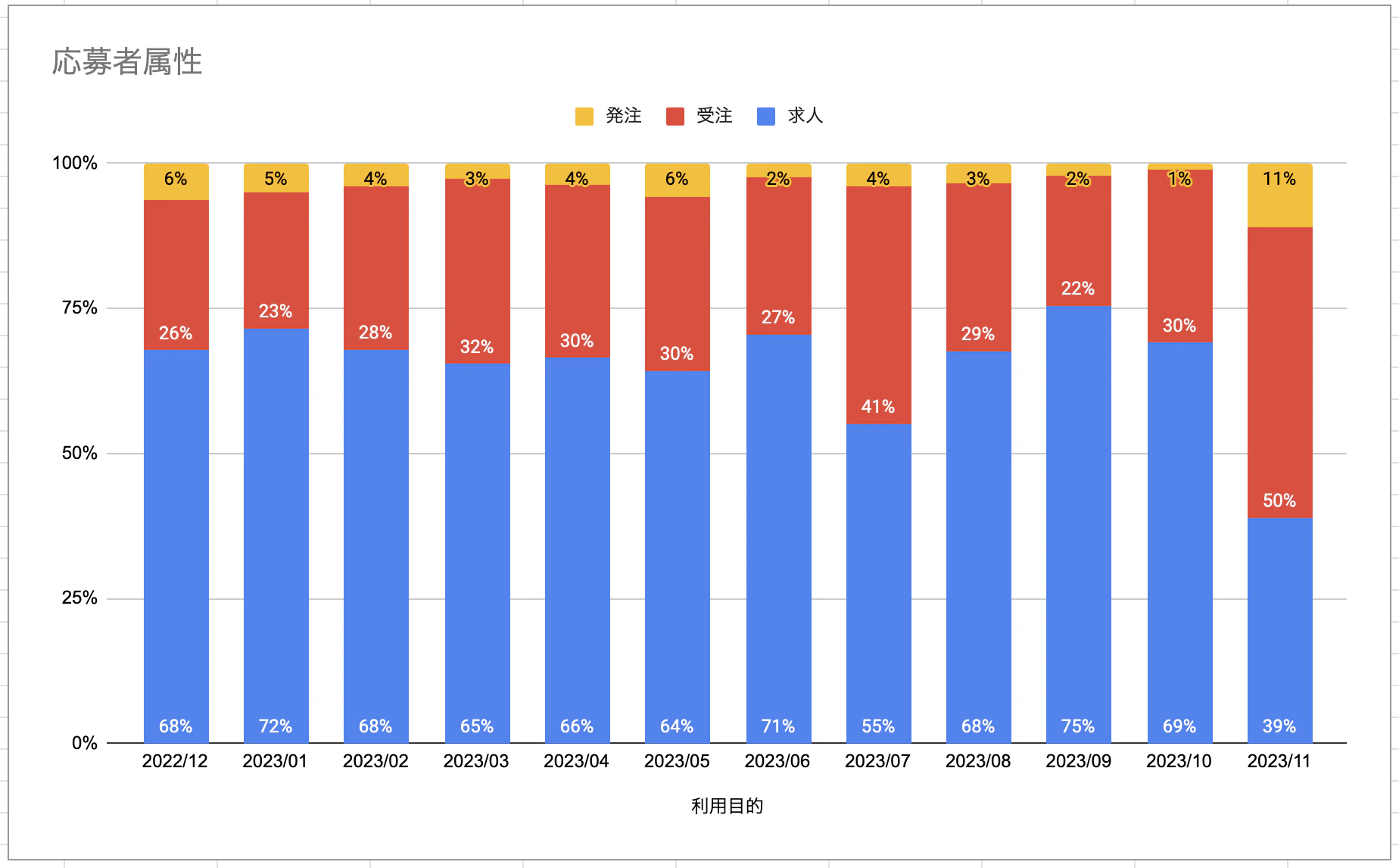 意外に思われるかもしれませんが、社員求人への応募者のなかで、受注ユーザーが一定割合いることが分かります。月によってばらつきはありますが、応募が少ない月でも22%、多い月ではなんと応募者の50%が受注ユーザーとなっています。