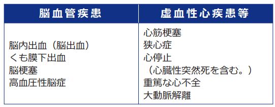 脳・心臓疾患として労災認定される病気には、以下のようなものがあります。*10