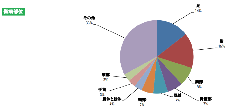同じ調査では、傷病部位、つまり怪我をした部位として足や指が多いという結果も報告されています。*3