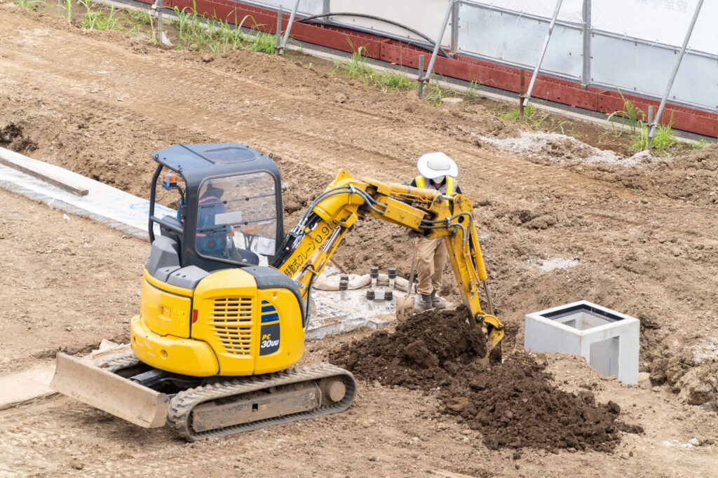 公共工事や建築現場の基本は、人力掘削ではなく重機で掘削を行い工程を進捗させます。補助を行う作業員と重機との衝突や巻き込まれる災害のリスクがあるため、安全への配慮が欠かせません。