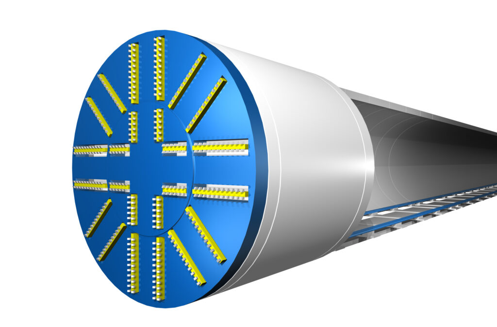 シールドマシンは、主にトンネルの掘削工事で使用される掘削機です。一般的な掘削工事は下に掘削していきますが、このシールドマシンは横方向に掘削していきます。