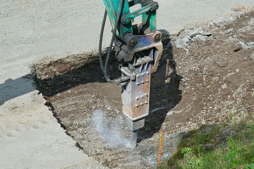 アーム先端に油圧ユニットと大きなチゼルが付いたアタッチメントで、油圧でチゼルに打撃を与え、大きな岩・コンクリートを破壊するために使用します。