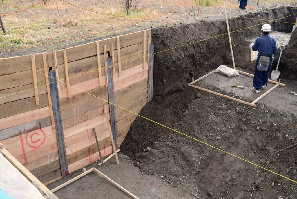 仮に家の基礎を地面にそのまま作ると、どこに荷重がかかるのか計算できず、構造的に危険な家が完成します。余談ですが、力は弱いところに逃げます。よって掘削工事では、余分な土砂を除去し寸法を適正に管理することが重要です。