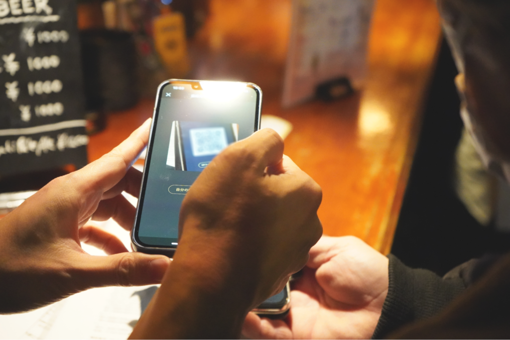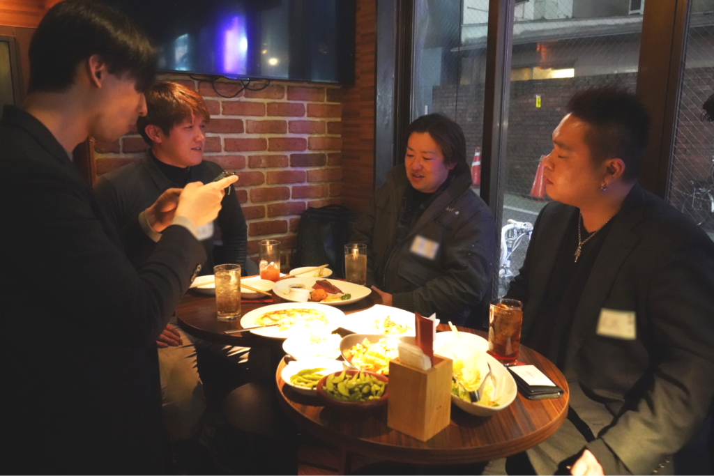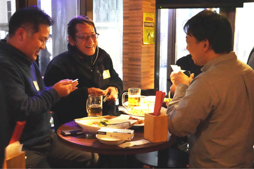 当日は、参加者同士がQRコードを使ったリアルマッチング機能を活用し、交流する場となりました。お酒を交えながら、仕事の話、業界の話、若い頃の話などで盛り上がり、さまざまなつながりが生まれました。