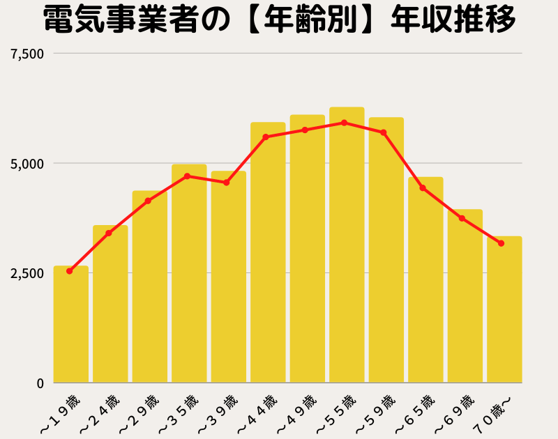 上記の表やグラフから分かることは、40代を越えた頃から年収が伸びてくるようです。年収のピークが50代であることが分かりますが、年収1000万円までは届きません。