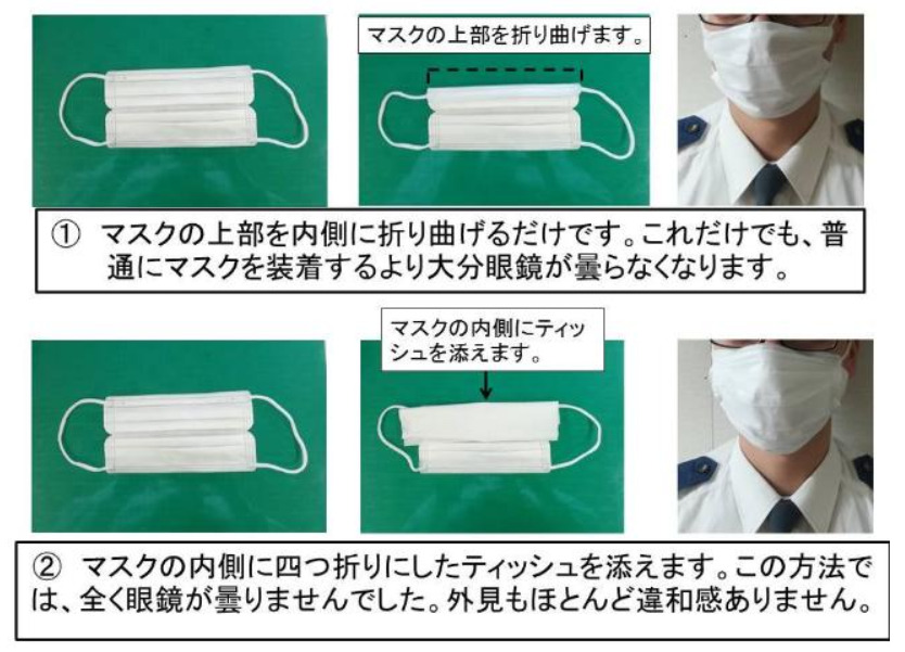 マスクと併用する場合は、マスクの上部を折り曲げたり、マスクの内側にティッシュを挟んだりするだけでメガネが曇りにくくなる(下図)*4。