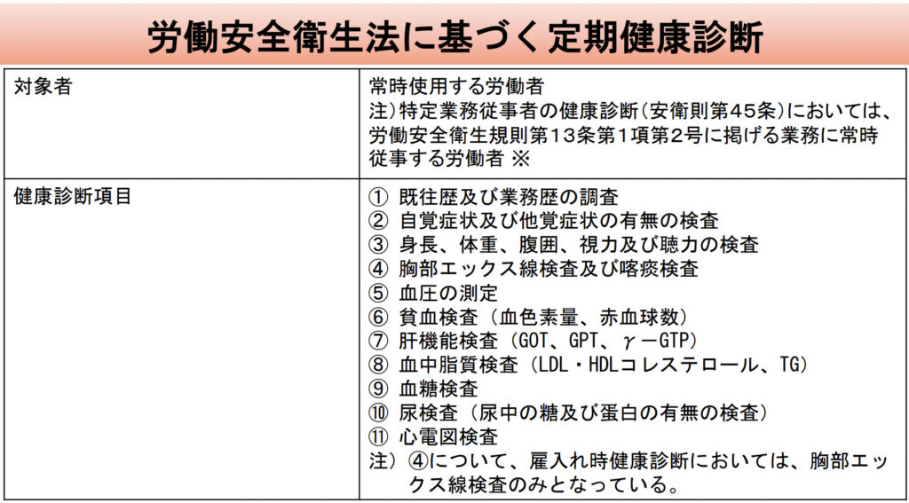 それは、労働衛生安全規則という法令の第四十四条で、事業者は労働者に対し、一年以内ごとに一回、決められた項目の検査を受けなければならないとされているからです。*1