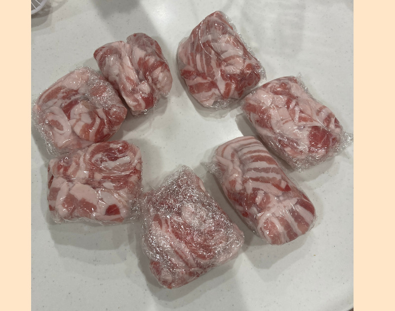 コストコで購入するとグラム単価で2割ほど安く購入することができます。量が多いため、100gづつ小分けにして冷凍しておくと使い勝手がいいです。写真では豚肉をラップに小分けにしています▼
