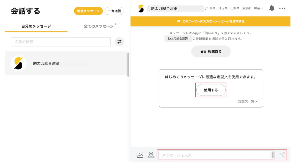 こちらはメッセージ画面です。「メッセージを入力」でメッセージを入力して送信することができます。また、はじめてのメッセージに最適な定型文を利用することもできます。