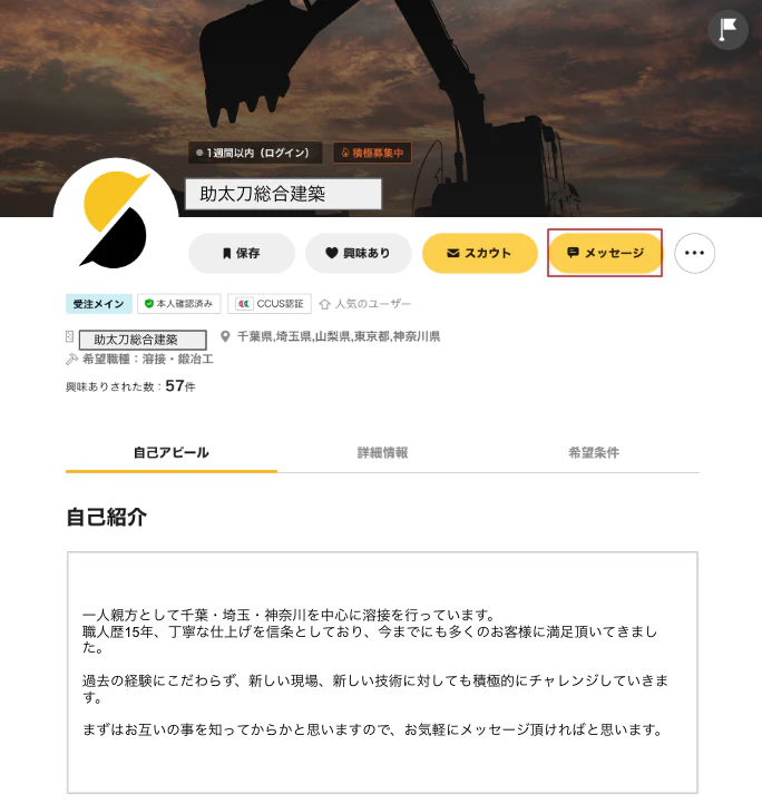 希望条件を指定して職人さんを検索し、「この人とつながりたい」と思った相手にメッセージを送る事ができます。