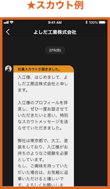あなたのプロフィールを見て、「一緒に働きたい」「会ってみたい」と思った企業から直接社員スカウトが届くので、 「待ってるだけ」でも転職活動ができる便利な機能です。