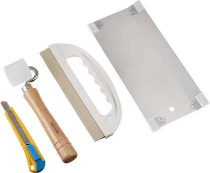 「道具自体はとても使いやすい。ローラーで圧着し、スクレイパーで角もきっちり貼れます。」