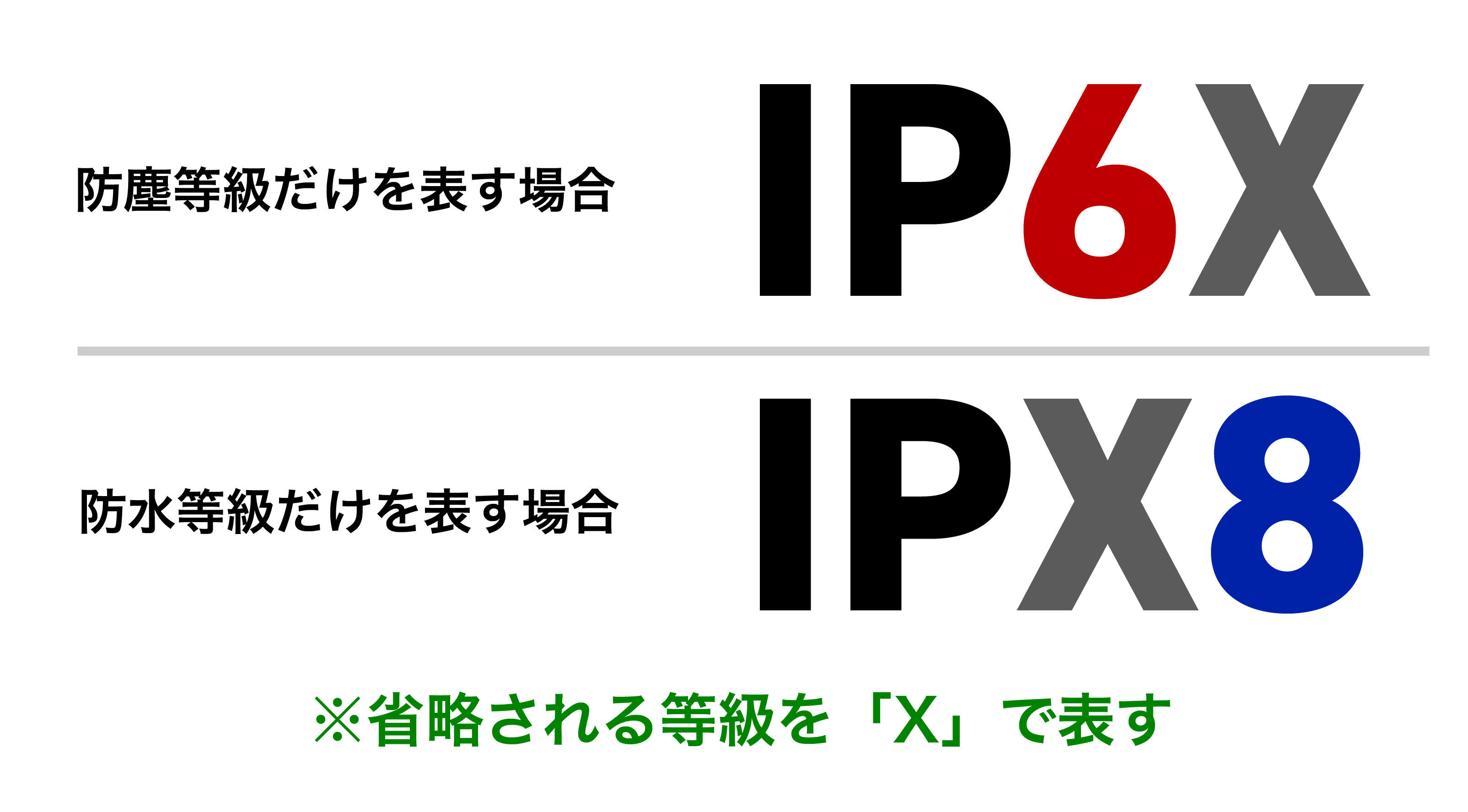 防塵、防水は、IP68のように表されるのが一般的で、2桁の数字の左側(ここでは6)が防塵、右側(ここでは8)が防水の性能を表しています。数字が大きいほど性能が高くなります。