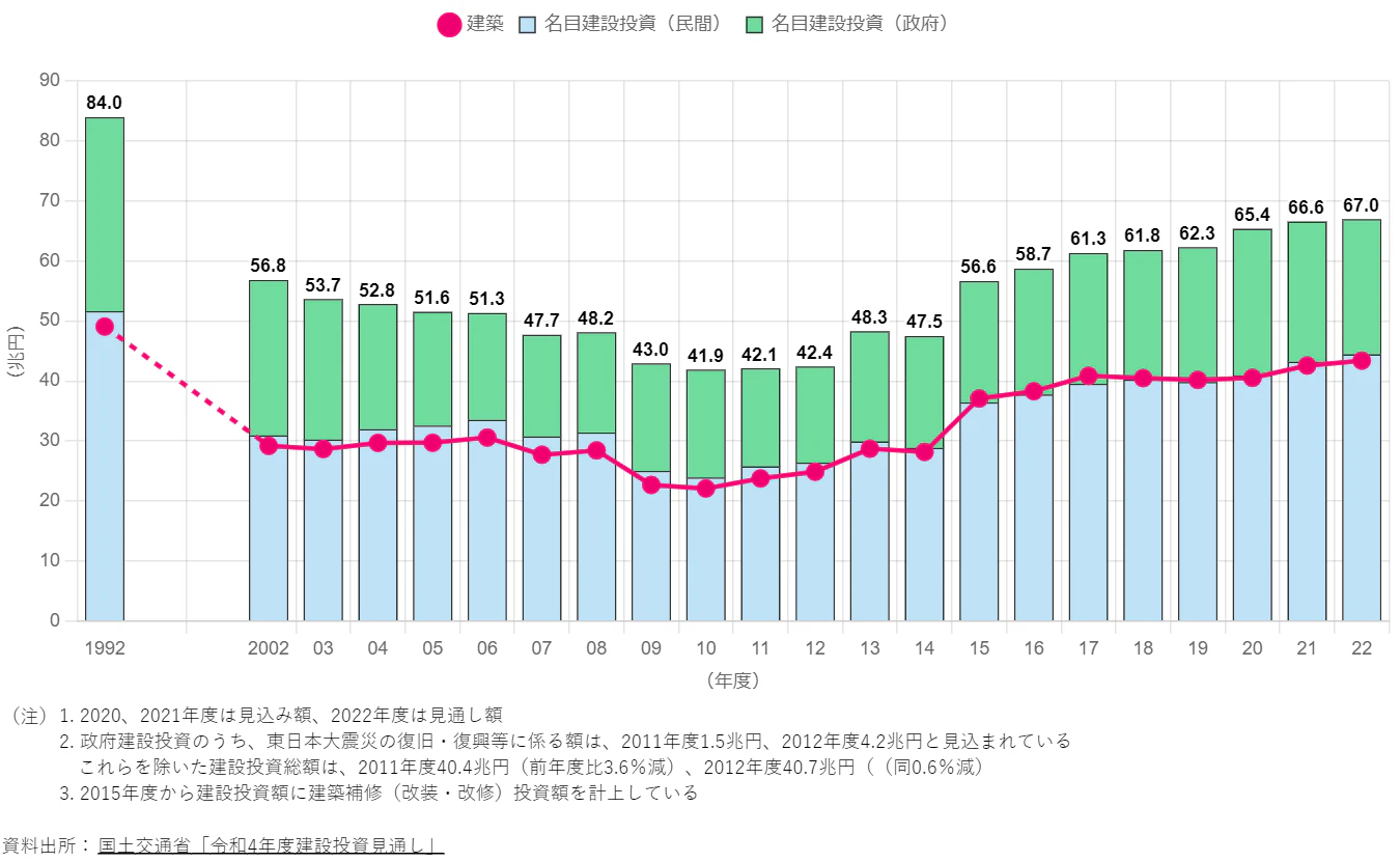 建設業は長い間、人手不足が大きな課題となっています。半面、建設業の投資額は2017年以降、年々上がり続けており、年間で60兆円を超えています。