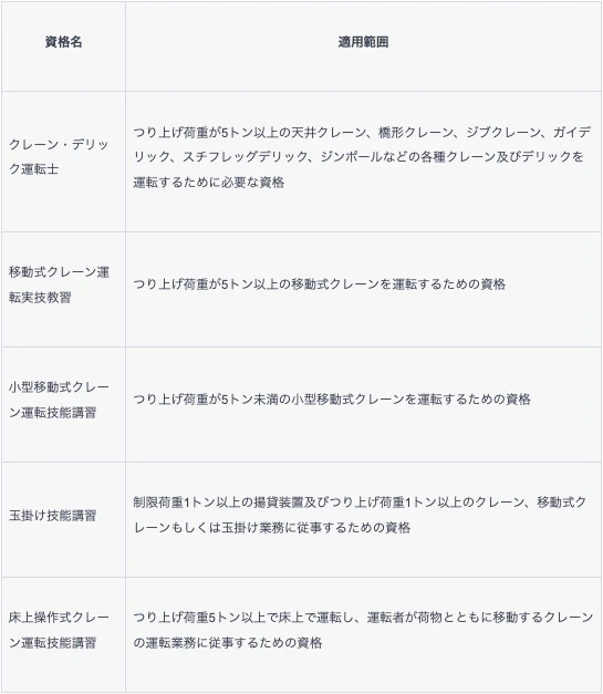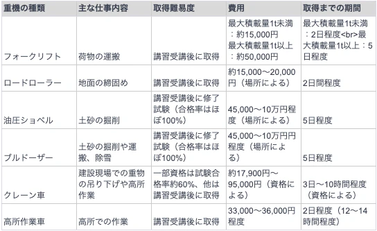 以下の表は、重機オペレーターの資格に関する情報をまとめたものです。