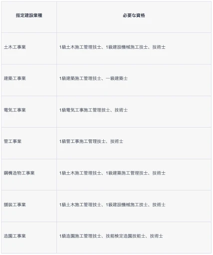 以下に、指定建設業7業種とそれぞれに対応する1級国家資格を表にまとめました。