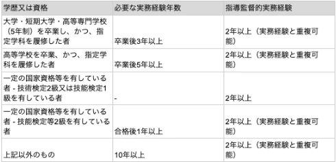 以下に、学歴や資格に応じた監理技術者資格取得のための実務経験の要件を表にまとめました。