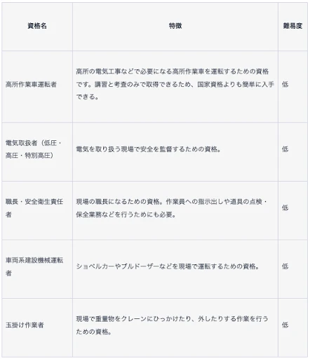電気工事現場で役立つ通常資格には、高所作業車運転者、電気取扱者(低圧・高圧・特別高圧)、職長・安全衛生責任者、車両系建設機械運転者、玉掛け作業者などがあります。これらの資格は、国家資格よりも取得難易度が低く、建設現場全般で役立つスキルが身に付きます。特定の資格を持つことで手当が支給される場合もあるため、取得を検討する際には、事前に会社に確認すると良いでしょう。