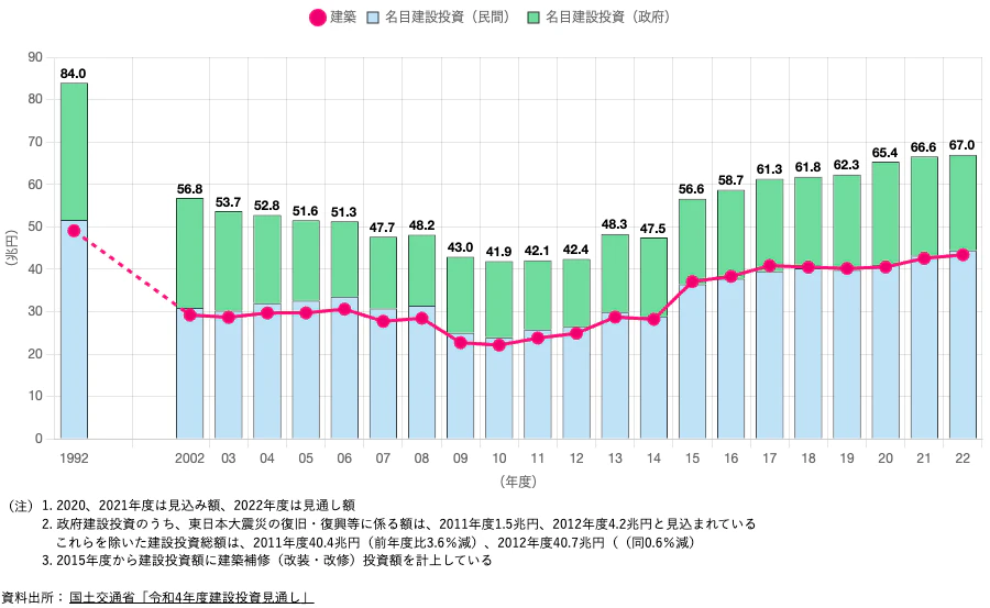 下のグラフは、日本の建設投資額の推移です。このグラフを見ると、日本の建設投資額は2015年以降、若干の上下はあるものの、安定して増加し続けていることがわかります。