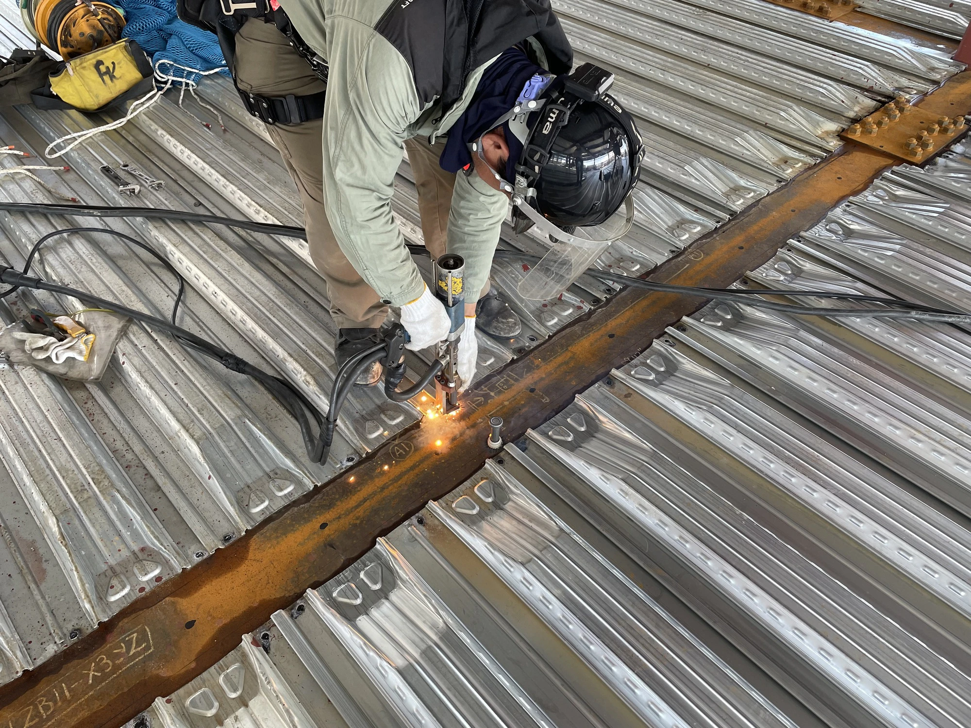 例えば、建設現場に届く鉄骨を現場に合わせて最適なサイズにカットし、鉄骨同士や固定したボルトなどを溶接し、強度を高めていきます。そのほか、階段の手すりの溶接や、工場の配管のメンテナンスや補修工事でも鍛冶工の職人さんが活躍しています。