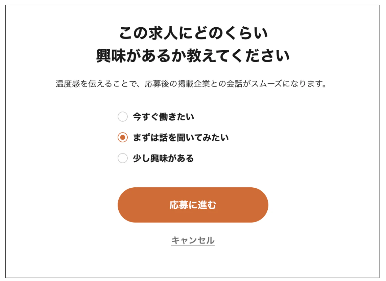 「まずは話を聞いてみたい」や「少し興味がある」を選んで応募すれば、応募企業に求人への温度感を伝えることができます。