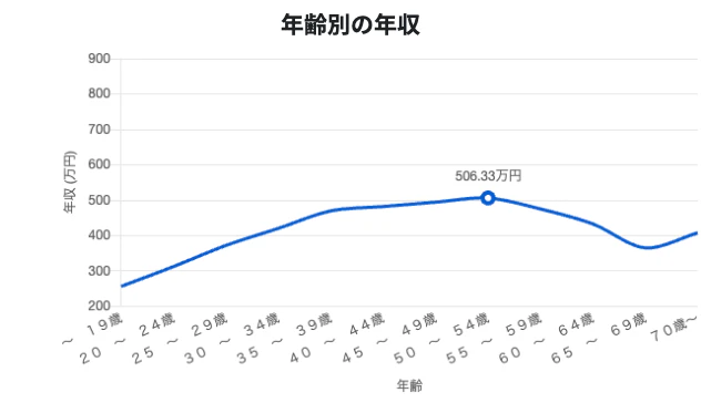 国税庁の「令和3年 民間給与実態統計調査」を参照すると、全職種の年齢改装別の平均給与は19歳以下で133万円。そこから年齢が上がるにつれて55〜59歳で529万円となっています。