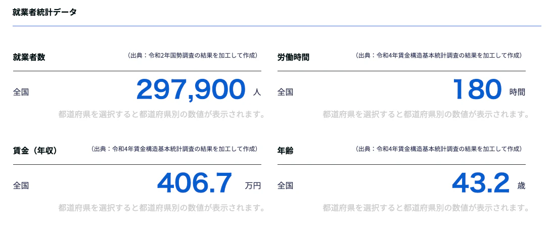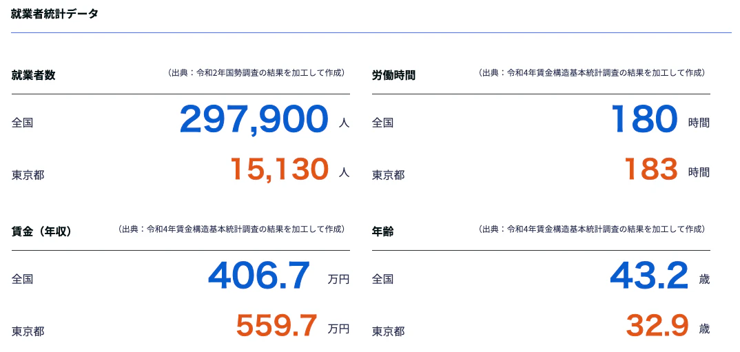 東京都では、平均年収は559.7万円となっており、全国平均より大幅に年収が高いです。また、平均年齢は32.9歳と、全国平均の43.2歳よりも10歳ほど若くなっています。