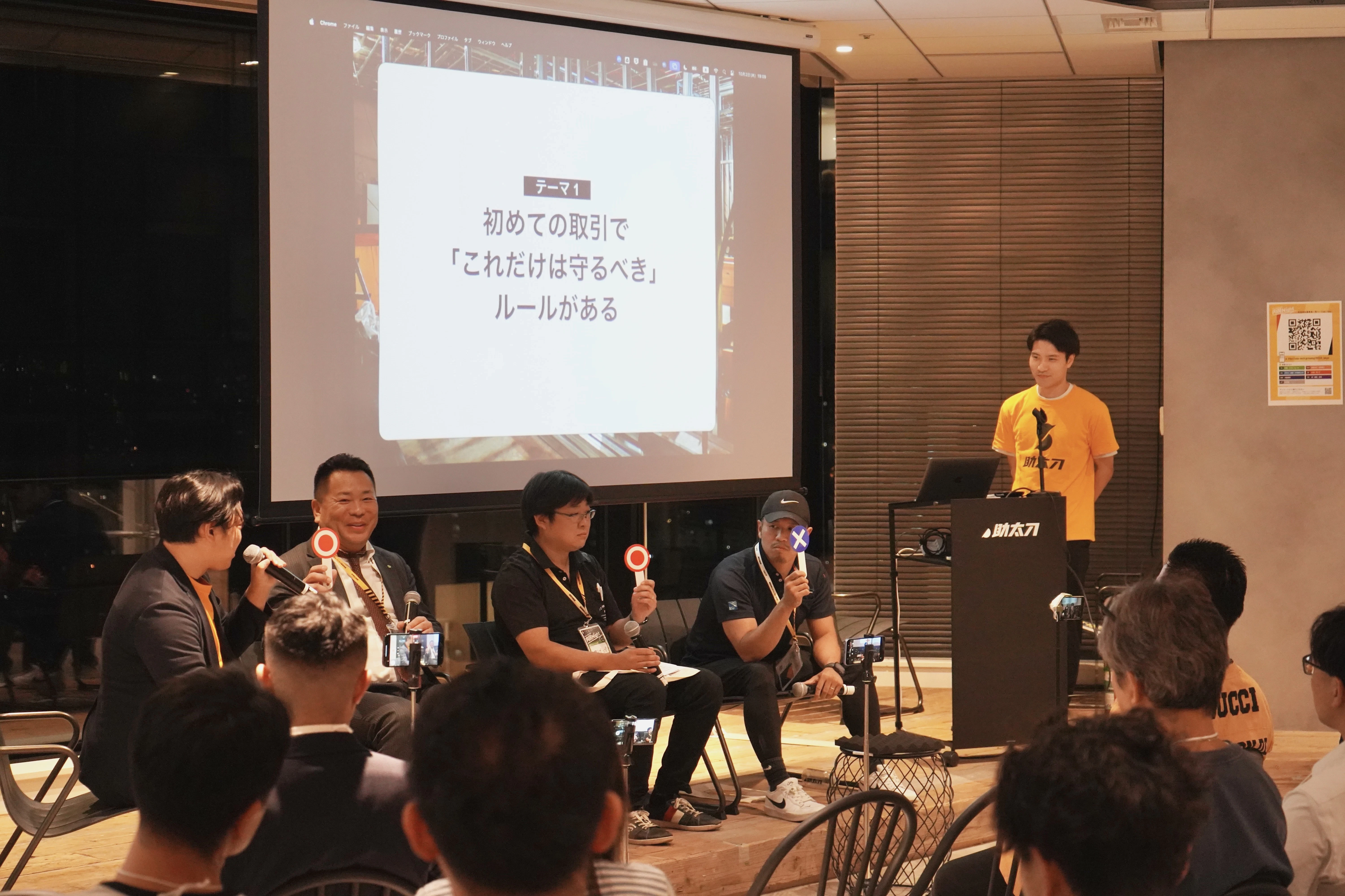 「内装Night」は、専門性の高い内装業界に特化し、新たな元請け・協力会社との出会いや同業者間の情報交換を目的としたイベントです。今回は通常の交流パートに先立ち、特別企画として「助太刀活用企業によるパネルディスカッション」を実施しました。