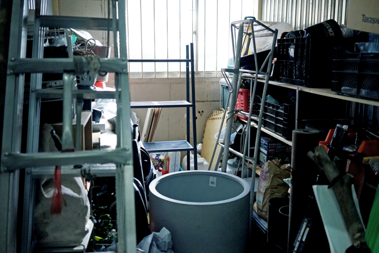 ハサミや鉢など八巻さんのこだわりの道具が揃った倉庫