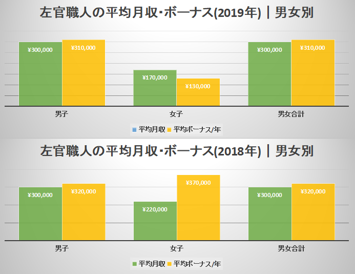 男性の平均月収は2018年と2019年ともに30万円、平均ボーナスは2018年では32万円、2019年では31万円と安定的な収入です。しかし女性の平均月収になると、2018年では22万円、2019年では17万円と5万円の差が出ています。