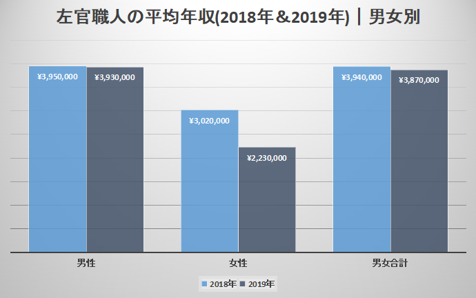男性の平均年収は2018年では395万円、2019年では393万円とそれほど誤差はありません。しかし女性の平均年収になると、2018年では302万円、2019年では223万円と79万円の誤差が出ています。