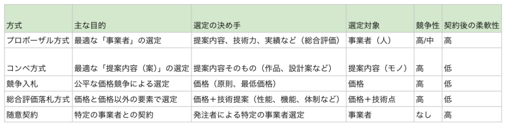 プロポーザル方式への理解を深めるため、他の契約・選定方法と比較してみましょう。それぞれの違いとポイントを整理します。