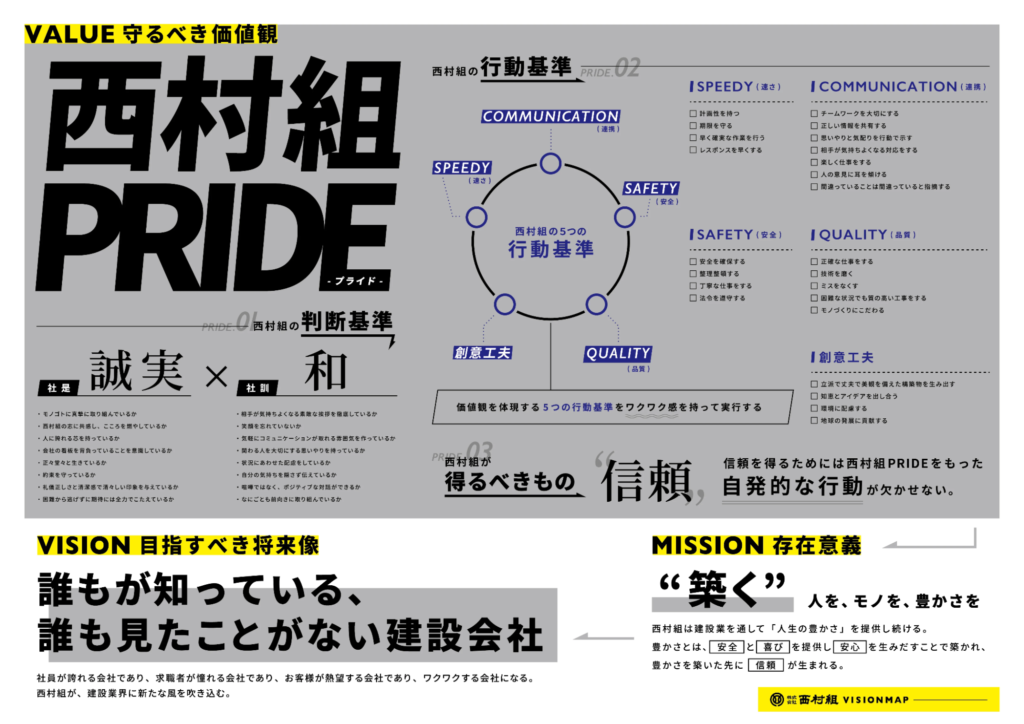 西村組がこのようなメッセージを発信しているのは、会社のビジョンに沿って全社的にブランディングを行っているからです。