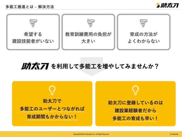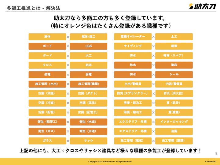 現在18万事業者を超えるユーザー数を誇り、既に多能工として活躍している人材や、多能工化を希望する人材、ある程度の経験と技術を持ち、育成期間が比較的短くなるであろう人材、若手の職人等、今までみつけることが出来なかった人材も助太刀なら出会える可能性があります。
