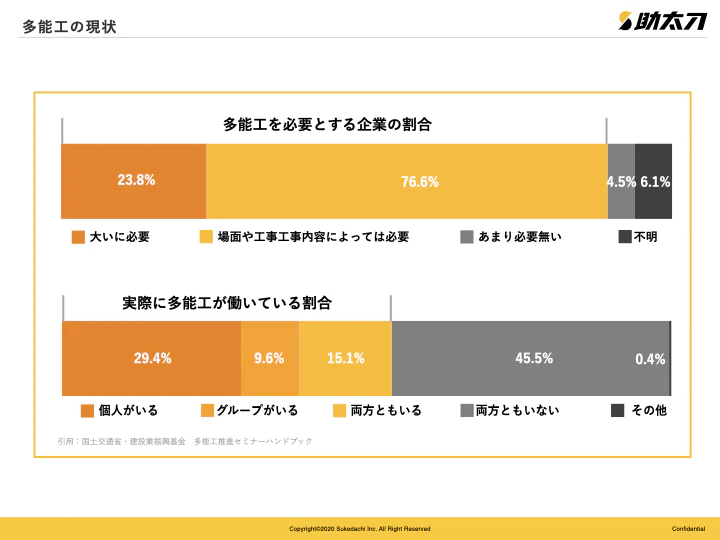 そこで、国としても、担い手の確保だけでなく担い手の減少に見合う「生産性向上」についても政策誘導を行う必要があり、地域社会を支える中小・中堅建設企業の生産性を向上させるためには、建設現場を担う技能者の専門技能の幅を広げることによる多能工化が有効であると考えました。